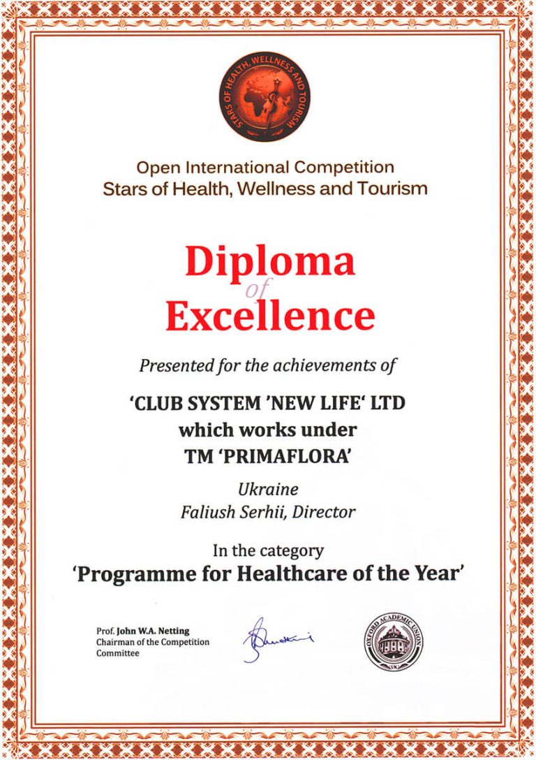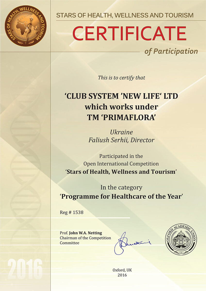 ТОВ “КЛУБНА СИСТЕМА” НОВЕ ЖИТТЯ”, ТМ “ПРИМАФЛОРА” отримала сертифікат учасника, який підтверджує її участь у Відкритому Міжнародному Конкурсі «Зірки медицини, охорони здоров’я та оздоровчого туризму» у категорії “Програми з охорони здоров’я року”.